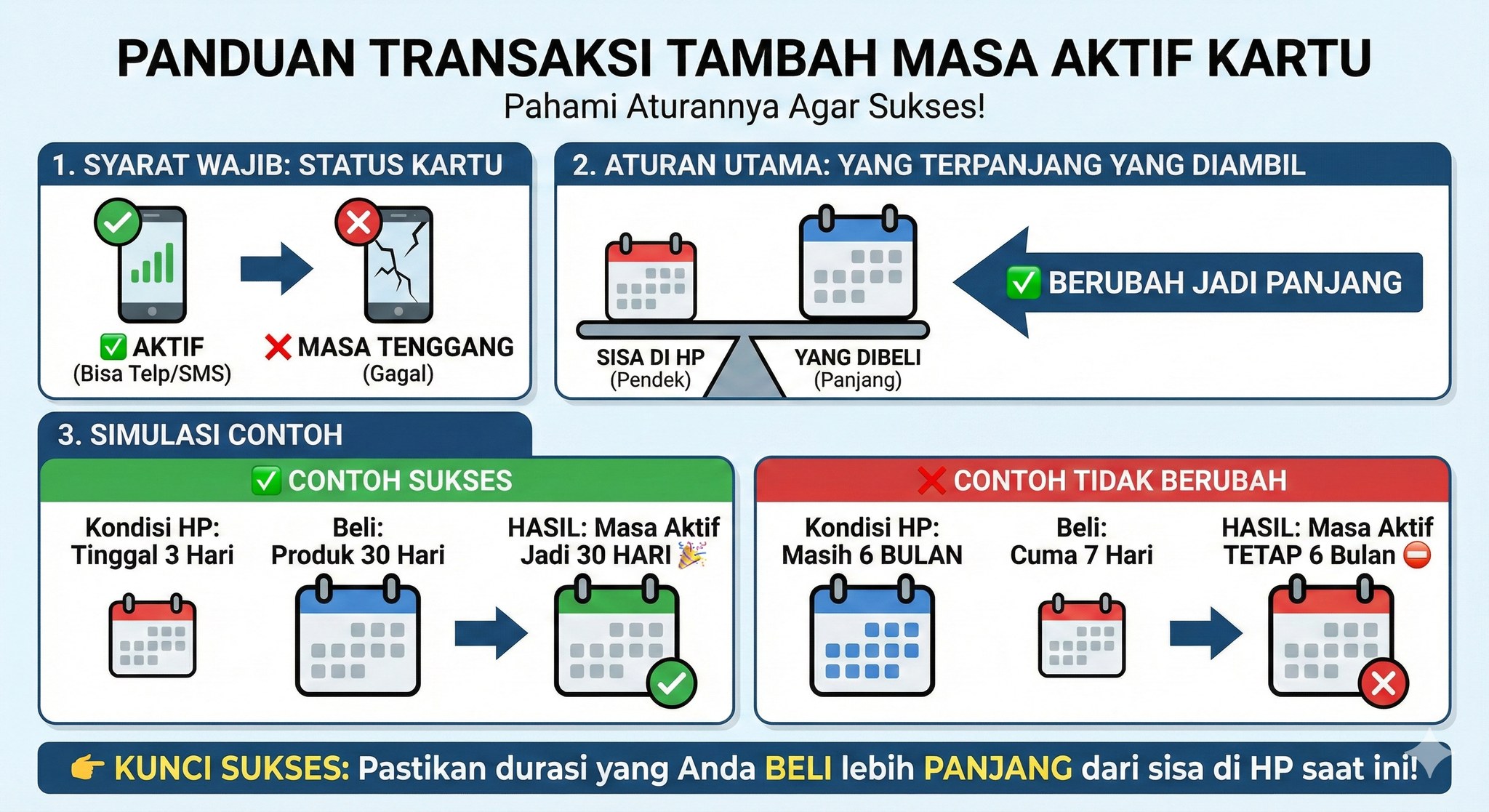 1️⃣ STATUS KARTU: Wajib AKTIF (Bukan Masa Tenggang). 2️⃣ DURASI: Pastikan masa aktif yang Anda BELI durasinya LEBIH LAMA daripada sisa masa aktif di HP Anda sekarang.